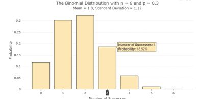 Explore how the shape of the Binomial distribution depends on the parameter n (the sample size) and p (the probability of success in a Bernoulli trial). Find and visualize probabilities of diverse kinds.