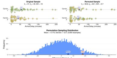 Create and visualize, step-past-stride, the permutation distribution for statistics such equally the difference of means or medians or the t-statistic. Obtain summary statistics (such every bit percentiles) and find the permutation P-value.